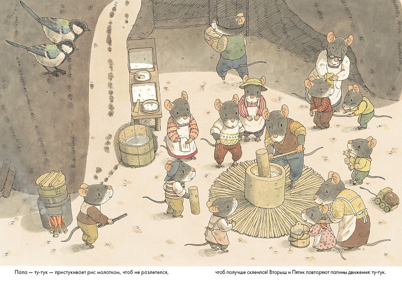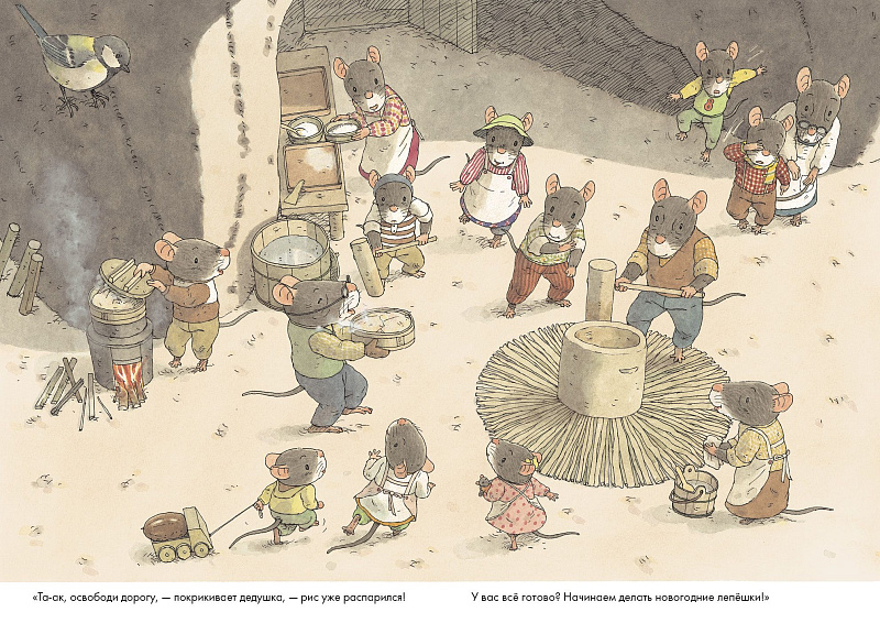 В каждой стране свои новогодние традиции! В книге «14 лесных мышей. Новый год» мышиное семейство готовит традиционное японское новогоднее блюдо — рисовые лепешки о-моти. Как любое праздничное блюдо, лепешки требуют усилий всех членов семьи — сделать тесто, развести огонь в специальных печурках, приготовить вкусные начинки! Чем больше постараться — тем вкуснее яства на новогоднем столе!