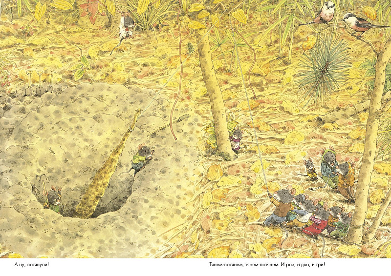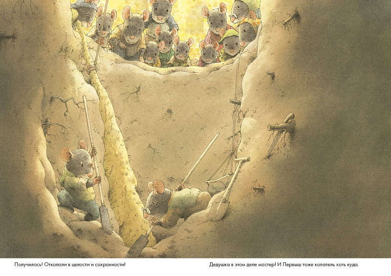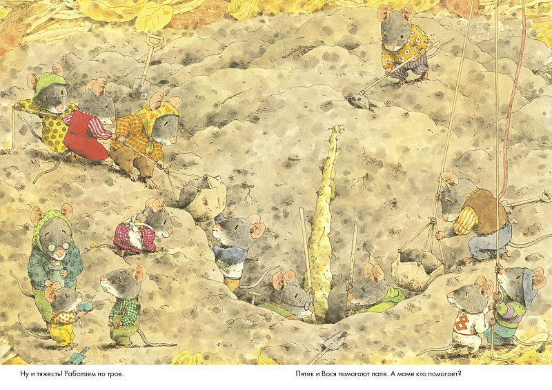 Большое и дружное мышиное семейство Кадзуо Ивамуры на этот раз отправляется копать батат — сладкую картошку. Это не то, что собирать семена или орехи — корень батата тянется глубоко под землёй! Но бабушка и дедушка, мама и папа и десять мышат справятся — все вместе. И, как обычно, подадут пример истинно японского упоения красотой жизни в каждом её моменте.
