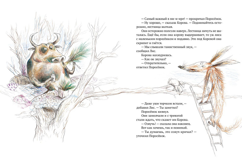 Бьёрн Рёрвик сочиняет небывалые сюжеты, придумывает новых животных, не боится быть не понятым — если в одном месте юмор не считает ребенок, его обязательно оценят родители. Друзья Лис и Поросенок постоянно попадают в какие-то переделки: ловят зверя, ворующего редиску, гоняются за гигантской кукушкой или таскают йогурт под видом редкой птички. Выбраться из них им помогает мудрая — нет, не сова — корова, которая обожает лазить по деревьям. Во время своих забав Лис и Поросенок сталкиваются с важными вопросами: как мириться, когда ссоришься, какие желания загадывать и как поддержать друга.