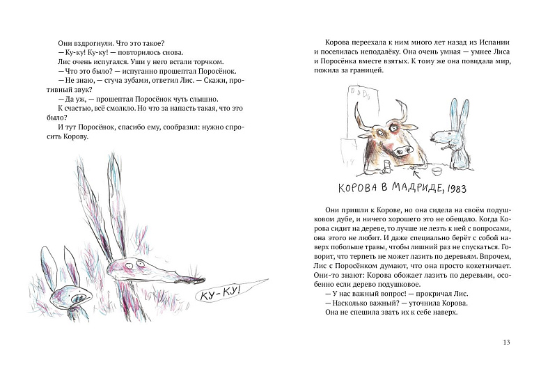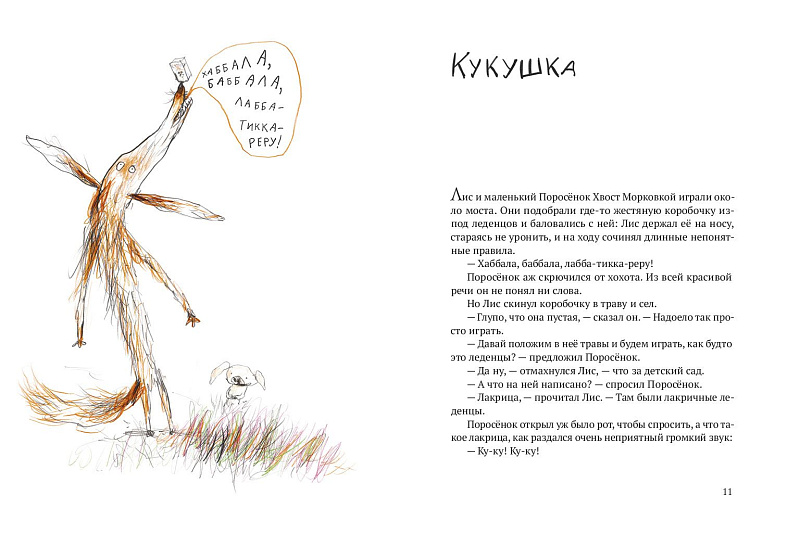 В первой книжке из серии историй о Лисе и Поросёнке мы знакомимся с ними и с другими удивительными персонажами. А кажется, что мы знакомы уже давно: с места в карьер, с первой же страницы, мы отправляемся с героями на поиски кукушки, которая исполняет любые желания, скачем верхом на королевской плюгавой, спасаем урожай редиски от вредной акулиски — грозы огородов, ищем драгоценные лисумруды и поросяхонты и притворяемся французским зелёным жаворонком, чтобы раздобыть йогурт с дыней.