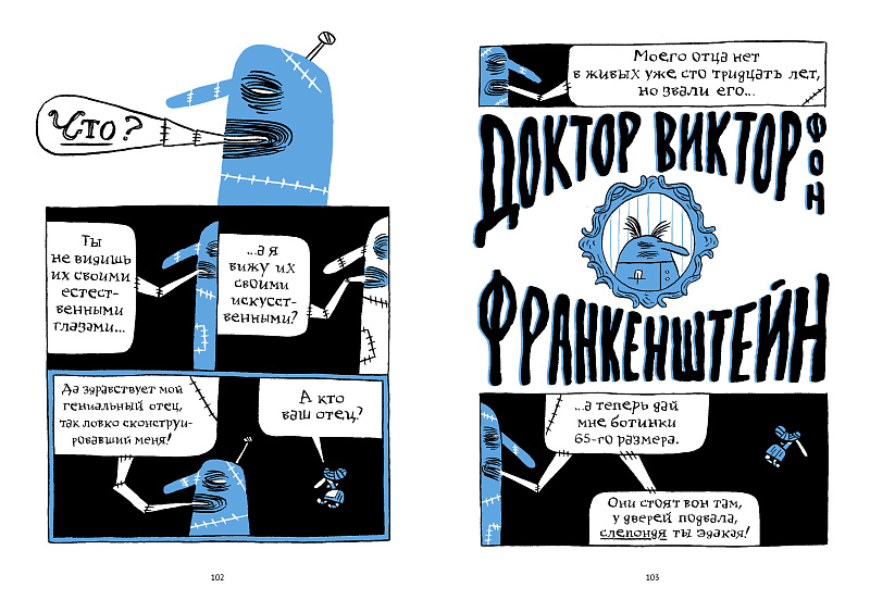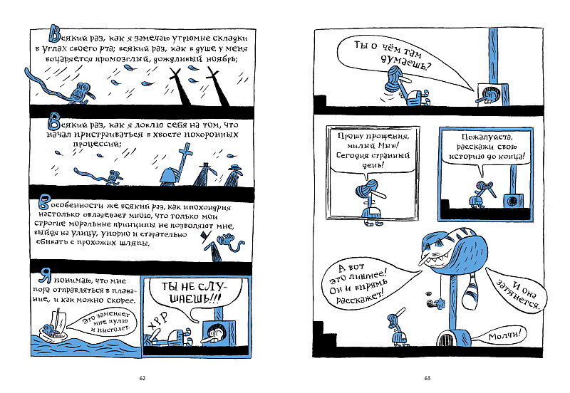 Австрийский художник Николас Малер не только сталкивает друг с другом героев «Алисы в Стране чудес» Льюиса Кэрролла, «Франкенштейна в Суссексе» Ханса Артманна, «Кандида» Вольтера и «Моби Дика» Германа Мелвилла, но и вплетает в сюжет философские труды европейских мыслителей прошлого столетия. Получается уморительно, абсурдно и немного трагично.