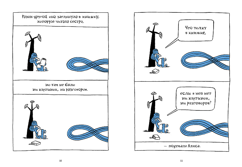 Алисе постепенно наскучило сидеть на берегу реки и ничего не делать. Разок-другой она заглянула в книжку, которую читала сестра, но там не было ни картинок, ни разговоров. «Что толку в книжке, если в ней нет ни картинок, ни разговоров», — подумала Алиса. Она сидела и размышляла, не встать ли ей и не нарвать ли маргариток, чтобы сплести венок, как вдруг… перед ней появился Кролик и предложил ей показать первое, богато иллюстрированное издание. Принимая приглашение, могла ли Алиса вообразить, какие злоключения и встречи ждут её в подземном доме?