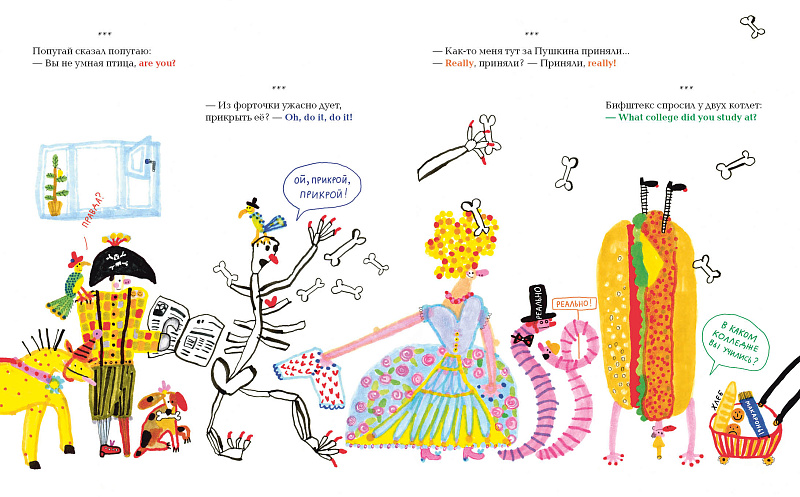 Эта макароническая книга — первый в мире учебник английского языка для маленьких попугаев. Попугаи — удивительно талантливые птицы. Им чрезвычайно легко даются языки: ведь им всё равно, на каком языке говорить, можно даже на двух сразу! Такую речь люди еще называют «макаронической». Поэтому именно для попугаев поэт Евгений Клюев и написал учебник в стихах на двух языках, а иллюстратор Полина Калашникова придумала целый виммельбух ко всем запоминающимся выражениям. Правда, читать попугаи не умеют, но зато умеют повторять, так что нам всего-то и надо, что немножко им помочь.