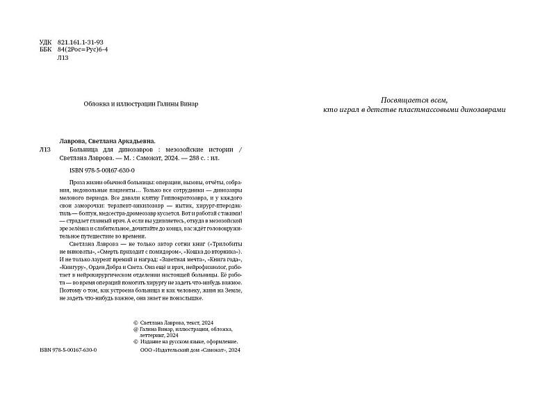 <p> Проза жизни обычной больницы: операции, вызовы, отчёты, собрания, недовольные пациенты… Только все сотрудники — динозавры мелового периода. Все давали клятву Гиппократозавра, и у каждого свои заморочки: терапевт-анкилозавр — нытик, хирург-птеродактиль — болтун, а медсестра-дромеозавр кусается. Вот и работай с такими! — страдает главный врач. А если вы удивляетесь, откуда в мезозойской эре зелёнка и слабительное, дочитайте до конца, вас ждёт головокружительное путешествие во времени. </p> <p> Светлана Лаврова — не только автор сотни книг («Трилобиты не виноваты», «Смерть приходит с помидором», «Кошка до вторника»), лауреат премий и наград («Заветная мечта», «Книга года», «Книгуру», Орден Добра и Света). Она еще и врач, нейрофизиолог, работает в нейрохирургическом отделении настоящей больницы и во время операций помогает хирургу не задеть что-нибудь важное. Поэтому о том, как устроена больница и как человеку, живя на Земле, не задеть что-нибудь важное, она знает не понаслышке. </p> <b>5 причин купить книгу «Больница для динозавров: мезозойские истории»:</b> <ul> <li> <p> Юмористический и фантастический роман-детектив для тех, кому за 10; </p> </li> <li> <p> Вы любите динозавров? Если нет, этих точно полюбите. Даже если вам давно не 10; </p> </li> <li> <p> Врачебный юмор с долей здорового цинизма — лучший способ научиться легче и веселее воспринимать мир; </p> </li> <li> <p> Светлана Лаврова — непревзойденная фантазёрка, мастер каламбуров и философ. А ещё автор более ста книг, практикующий врач-нейрофизиолог и знаток доисторических времён; </p> </li> <li> <p> Книга дополнена смешными и милыми иллюстрациями Галины Винар. </p> </li> </ul> <p> ЦИТАТЫ ИЗ КНИГИ: </p> <p> «— На вызов пойдёт Трот. — И Струм посмотрел на троодонта, ожидая возражений. Правильно ожидал. </p> <p> — Почему я? Опять я! Чуть сложный случай, так сразу я! А до Алика знаете сколько идти? </p> <p> — Он совсем рядом живёт, у реки, — сказал Струм. </p> <p> — А по самому аламозавру сколько идти? У него длина двадцать метров! Если не тридцать! А во мне, между прочим, меньше двух! </p> <p> — Всё, разговор окончен, — сказал Струм. — Второй вызов? </p> <p> — У трицератопсов два детёныша покрылись сыпью. </p> <p> — Опять ветрянка, — кивнул Анзу. — Уже второй случай на третьем участке. Я беру десять литров зелёнки и иду. </p> <p> — А я читал в «Вестнике терапевта», что современные врачи уже не мажут сыпь зелёнкой, — сказал терапевт Эдмон. — Ты угробишь детей своей ядовитой зелёнкой. И сам умрёшь от её вредоносных паров. Это устаревший метод. </p> <p> — Устаревший, зато проверенный, — возразил Анзу. — Трицератопсы любят зелёнку. Зелёных детёнышей в зелёной траве ни один хищник не найдёт. Профилактика травматизма. </p> <p> Травматизмом деликатно называлось, когда кто-нибудь кого-нибудь съел. А что, не травма, что ли?» </p>