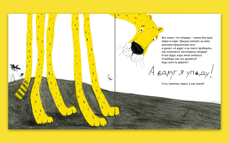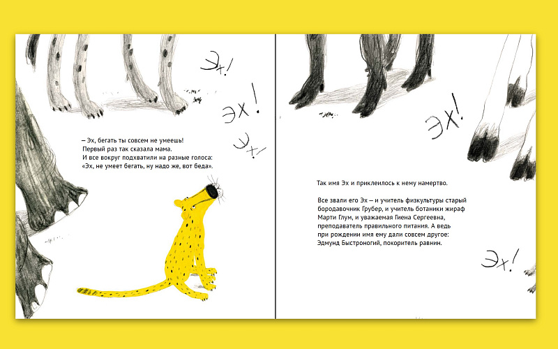 Как известно, гепарды — самые быстрые животные в мире. Но маленький Эх — вот позор-то! — никак не может научиться бегать. Стоит ему подумать о своих длинных ногах, как они тут же заплетаются и Эх падает на землю. Но проблема тут, конечно, не в ногах, а в страхе и неуверенности. Однажды, блуждая по саванне, Эх встречается с летучей мышью Мышехвостом. Разговор так захватывает Эха, что когда Мышехвост посреди фразы срывается с ветки, гепард не думая ни секунды пускается за ним. И бежит, бежит и бежит — сначала за историей, а потом уже просто так, с наслаждением, как все гепарды.