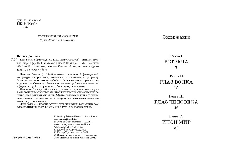 <p> В Парижском зоопарке происходят невероятные события: одноглазый полярный Волк и маленький африканский мальчик молча рассказывают друг другу истории, одна удивительнее другой. В двух зрачках — мальчишечьем и волчьем — мелькают, сменяя друг друга, заснеженная Тундра, желтая, серая и зеленая Африки. Где-то там, в прошлом, звучат выстрелы, раздаются крики, шум пропеллеров и вой шакалов, вспыхивают золотые блестки и дождь обволакивает джунгли. Волк и мальчик пристально смотрят друг на друга. И чем больше узнают друг друга, тем яснее понимают, что будь ты волком или мальчиком, верблюдом или гепардом — если тебе хватило терпения и мудрости услышать историю чужого сердца и откликнуться на нее, ты больше не одинок. Оставаясь по разные стороны решетки зоопарка, Волк и мальчик по имени Африка сломают клетку недоверия и подозрительности — клетку, в которой может очутиться каждый и из которой не выбраться поодиночке. </p> <h2>5 причин купить книгу «Глаз волка»:</h2> <ul> <li> <p> Повесть о величии природы и взаимоуважении;<br> </p> </li> <li> <p> Размышление над судьбами гонимых и брошенных существ, которые в конце концов могут найти себе место в мире; </p> </li> <li> <p> Если посмотреть внимательно в глаза другого, то можно увидеть там уникальную историю. И каждая история ценна; </p> </li> <li> <p> Даниэль Пеннак — звезда современной французской литературы, автор-легенда, его книги входят в школьную программу Франции; </p> </li> <li> <p> Мы выпустили эту книгу ещё в 2003 году, в первый год работы издательства. Теперь мы переиздаём её в серии «Классика Самоката», в которую включаем важнейшие книги в истории нашего издательства и мировой детской литературы. </p> </li> </ul> <br> <b>ЦИТАТЫ ИЗ КНИГИ:</b><br> <br> <p> <i>«Странная штука жизнь... Вот вам говорят про что-то, о чем вы не имели ни малейшего понятия, про что-то такое, что и вообразить невозможно, во что трудно поверить, и вот, едва вам про это сказали, вы сами с этим сталкиваетесь».</i> </p> <p> <i>«</i><i>— Тьфу, — решил про себя волк,— было бы на что смотреть, тут и одного глаза более чем достаточно».</i><br> </p> <p> <i>«</i><i>—Ты слишком много смеешься, — ворчал Голубой Волк, — это несерьезно.</i> </p> <p> <i>— </i><i>А ты слишком серьезный, это не смешно»</i><i>. </i> </p> <p> <i>«— А на что они похожи?</i> </p> <p> <i>— Люди? Две лапы и ружье».</i>  </p>