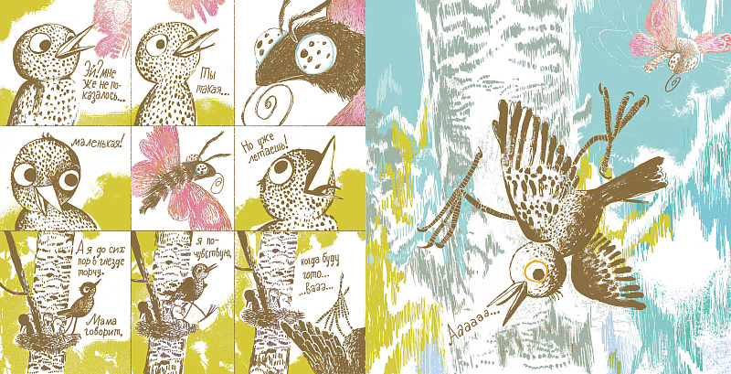 Герои книги говорят голосом Дианы. Задача была в том, чтоб соблюсти баланс между человеческими чертами животных и фактами их реальности. Надо было придумать, с какой интонацией заговорил бы тот или иной биологический вид, случись у него словесные способности. Кому какое бы имя дала мама, кто бы шепелявил, а кто бы только таращился молча. А саму канву «одиссеи слётка» мы задумывали ещё с Женей Некрасовой.