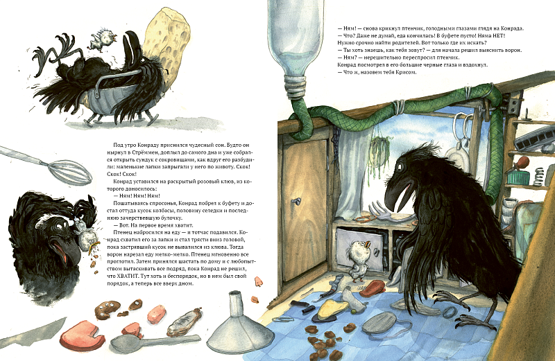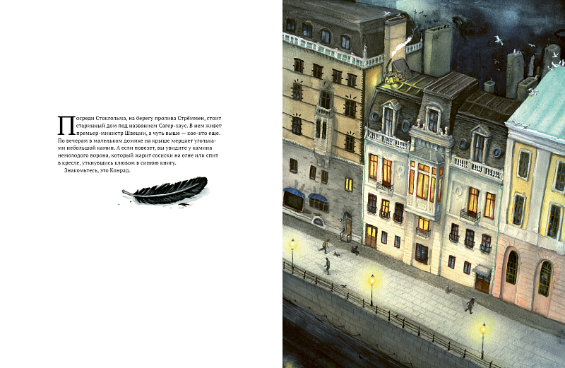 На крыше маленького домика посреди Стокгольма живет ворон Конрад. По вечерам он жарит сосиски на огне или спит в кресле, уткнувшись клювом в книгу. Но однажды тишину нарушают крики о помощи: только этого не хватало, птенец чайки выпал из гнезда и потерялся! Конрад не любит чаек, он хочет как можно скорее найти родителей и избавиться от вечно голодного птенчика. Но это не так уж и просто, дело принимает детективный оборот!