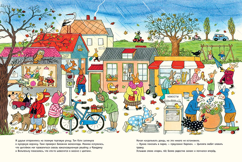После прочтения этой почти детективной истории маленьким читателям предлагается выполнить задания: найти на каждом развороте божью коровку, стрекозу, ворона, сову, белку, утку, кузнечика, улитку, мышь, аиста и лягушку. Кто-то из них встречается с самой первой страницы, а кто-то появляется чуть позже. А ещё на каждом развороте нужно найти цыплёнка. Да-да, Карлхен и его друзья просто не замечали маленького шалуна, который решил поиграть с ними в прятки, но внимательные читатели обязательно его отыщут.