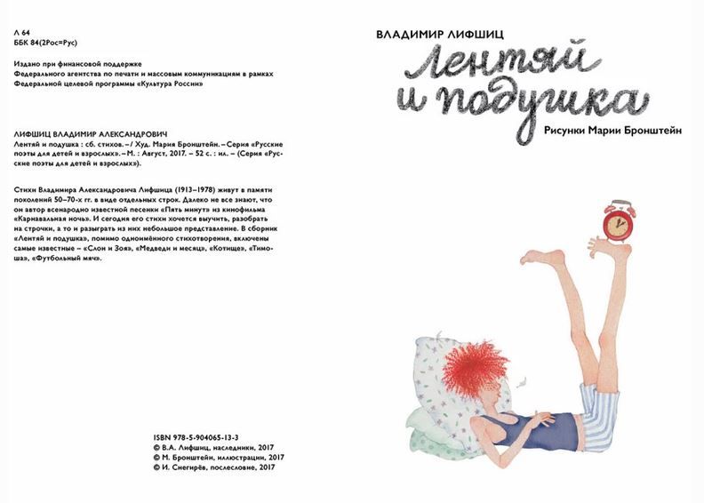 Стихи Владимира Александровича Лифшица (1913-1978) живут в памяти поколений 50-70-х гг. в виде отдельных строк. Далеко не все знают, что он автор всенародно известной песенки "Пять минут" из кинофильма "Карнавальная ночь". И сегодня его стихи хочется выучить, разобрать на строчки, а то и разыграть из них небольшое представление. В сборник «Лентяй с подушкой», помимо одноимённого стихотворения, включены самые известные - «Слон и Зоя», «Медведи и месяц», «Котище», «Тимоша», «Футбольный мяч».