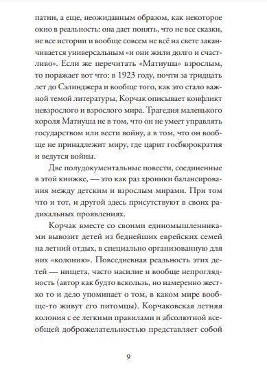 Повести Януша Корчака «Лето в Михалувке» и «Лето в Вильгельмувке» были впервые опубликованы в Варшаве больше ста лет назад, и поразительно, насколько актуальными они остаются, насколько стиль и идеи Корчака не устарели со временем. Так и хочется побывать в этих летних «колониях»-лагерях вместе с теми детьми: сразиться за право съесть горбушку, поучаствовать в товарищеском суде, построить корабли на деревьях, собрать корзинку грибов или послушать перед сном те самые истории того самого Януша Корчака. Ведь это и есть счастье! Счастье — не только быть ребенком, но и быть рядом с ребенком, учиться его понимать и вместе с ним стараться понять этот не всегда счастливый «взрослый» мир.