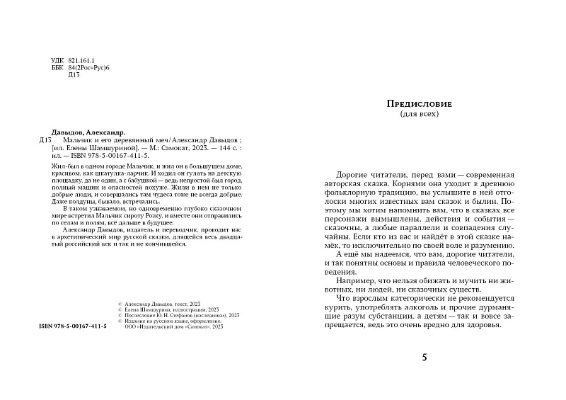 Жил-был в одном городе Мальчик, и жил он в большущем доме, красивом, как шкатулка-ларчик. И ходил он гулять на детскую площадку, да не один, а с бабушкой – ведь непростой был город, полный машин и опасностей похуже. Жили в нем не только добрые люди и совершались там чудеса тоже не всегда добрые. Даже колдуны, бывало, встречались.<br> В таком узнаваемом, но одновременно глубоко сказочном мире встретил Мальчик сироту Розку, и вместе они отправились по селам и полям, всё дальше в будущее.<br> Александр Давыдов, издатель и переводчик, проводит нас в архетипический мир русской сказки, длящейся весь XX российский век и так и не кончившейся. <h2>5 причин купить книгу «Мальчик и его деревянный меч»:</h2> <ul> <li> <p> Современная сказка, замешанная на русском фольклоре ; </p> </li> <li> <p> Путь Мальчика от Санкт-Петербурга до Китая полон опасностей и приключений;<br> </p> </li> <li> <p> Метафорическая история XX века;<br> </p> </li> <li> <p> Хороший повод поговорить с детьми о прошлом семьи;<br> </p> </li> <li>Нуарные иллюстрации Лены Шамшуриной погружают в сказочную атмосферу с первых страниц. <br> </li> </ul> <p> <b> АВТОР О КНИГЕ: </b> </p> <p> Вообще-то, я пишу книги для взрослых, а эту сказку-быль сочинил для своего сына, чтобы в занимательной форме ему передать свой жизненный опыт и понимание мира, в котором существуем. Сыну тогда было лет десять, ему она понравилась. Но сперва я не собирался ее печатать. Прошли годы, сын уже вырос, когда я сообразил, что, может быть, сказка и другим детям будет интересна. В результате, она вышла в сборнике фантастики, но это, конечно, было не то чего я бы хотел. Сказки надо издавать красиво, празднично, с яркими иллюстрациями. Прошло еще много лет. Успел вырасти и внук, которому моя быль тоже в детстве нравилась. Честно говоря, я уже позабыл о ней, когда среди старых журналов вдруг наткнулся на тот самый сборник. Сам перечитал и отдал на «экспертизу» уже подросшему внуку. Мы оба решили, что сказка вовсе не устарела. Да ведь она и посвящена вопросам вечным, что доходчиво объяснил мой покойный друг, знаток всего на свете Юрий Стефанов в своем послесловии. Оно адресовано скорей взрослым, а умный ребенок и так всё поймет или почувствует.<span style="font-weight: 400;">  </span> </p>
