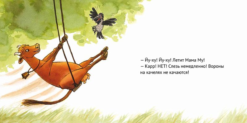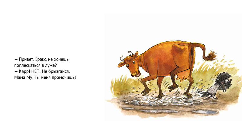Мама Му — корова, которая знает толк в развлечениях. Она не боится новых ощущений: вот она качается на качелях, топает по лужам в резиновых сапогах, а вот съезжает с горки прямо в воду! А ворона Кракс с большим подозрением относится ко всему новому. Ему кажется, что корова нарушает какие-то правила: коровы не должны съезжать с горок, читать книжки или кататься на санках. Но Мама Му делает столько всего интересного — почему бы в конце концов не попробовать?