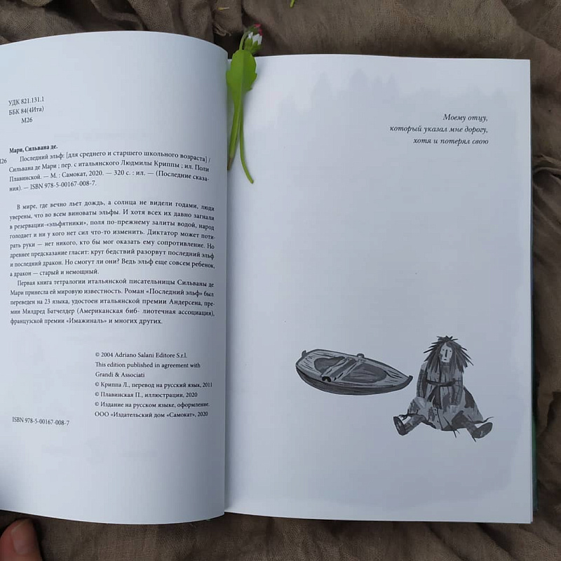 В мире, где вечно льет дождь, а солнца не видели годами, люди уверены, что во всем виноваты эльфы. И хотя всех их давно загнали в резервации-«эльфятники», поля по-прежнему залиты водой, народ голодает и ни у кого нет сил что-то изменить. Диктатор может потирать руки — нет никого, кто бы мог оказать ему сопротивление. Но древнее предсказание гласит: круг бедствий разорвут последний эльф и последний дракон. Но смогут ли они? Ведь эльф еще совсем ребенок, а дракон — старый и немощный. <br> Первая книга тетралогии итальянской писательницы Сильваны де Мари принесла ей мировую известность. Роман «Последний эльф» был переведен на 23 языка, удостоен итальянской премии Андерсена, премии Милдред Батчелдер (Американская библиотечная ассоциация), французской премии «Имажиналь» и многих других. <br> <br> Продолжение следует:<br> «Последний орк» (2021)<br> «Последнее волшебство»<br> «Последнее предсказание»<br> <br> <b>ОТЗЫВЫ О КНИГЕ</b><br> <br> Первая и вторая книги серии издавались на русском языке, имели большой успех у читателей. <br> В новом издании — новая редактура, иллюстрации — Поли Плавинской. <br> <br> <i>Книга очень понравилась! Тот редкий случай, когда сюжет и мысль существуют на равных. Язык отточенный — лаконичный и емкий. Покупала дочке на вырост, но, думаю, в 8 лет уже можно читать эту книгу. Есть такие книги, которые хороши в любом возрасте, и каждый возраст находит для себя что-то свое. «Последний эльф» из таких книг. Она способна пробуждать и побуждать к добру. <br> </i>                                                                              labirint.ru/reviews/show/209326/<br> <br> <i>Если честно, даже не ожидала, что книга ТАК понравится. Покупала детям, решила прочитать сама — и получила огромное наслаждение. Хороший язык. Очень добрая. Да, много плохого случается с эльфом, людьми, детьми, но воспринимается все это не как трагедия, от которой впору в петлю лезть, а как испытание, после которого каждый становится лучше.</i><br> <br>                                                                                 labirint.ru/reviews/show/222869/<br> <br> <br> <i>Эту книгу можно советовать всем, не представляю кому может не понравиться. Самая добрющая сказка. Маленький эльфик у меня вызывал улыбку, читала и смеялась. Для меня это книга года.</i><br>                                                                                 livelib.ru/book/1000452647/reviews/~2#reviews