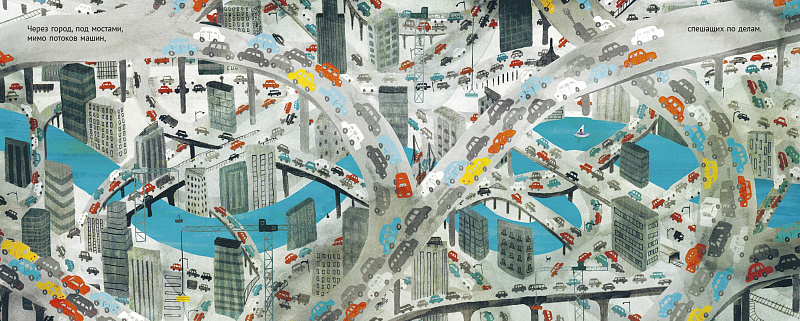 Картины, которые нам при этом открываются, всякий раз вызывают изумление и восторг, настолько они красивы. Знатоки наверняка вспомнят «Реку» Елены Сафоновой, но многоцветные пейзажи Мартина скорее напоминают работы Анри Руссо; тот, как известно, тоже любил изображать фантастические леса и джунгли, которых никогда не видел. Когда путешествие подойдёт к концу, и мы вернёмся в покинутый нами город, автор снова позовёт нас в путь. И книгу захочется прочитать ещё раз с самого начала. Очень впечатляющая книжка-картинка для неисправимых мечтателей.