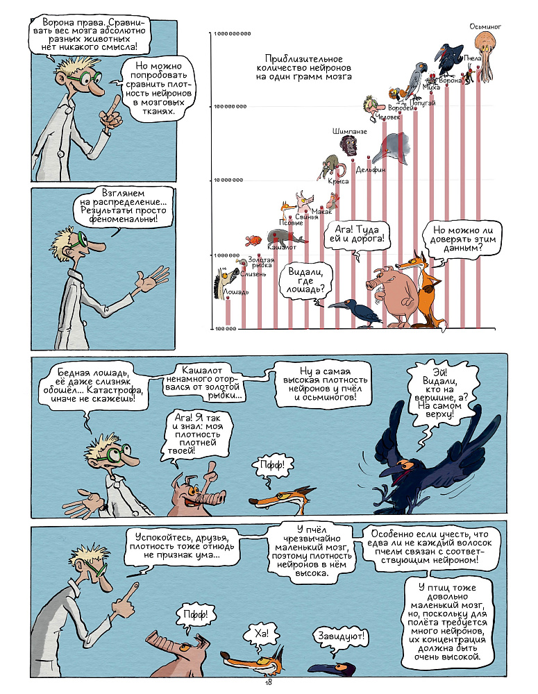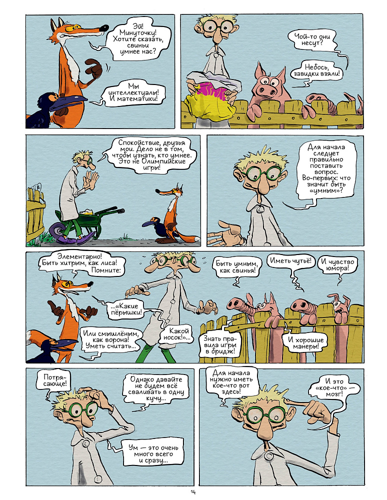 Однако Жиль Маканьо, знакомый нашим читателям по замечательной книге «Вредные или полезные: животные с дурной репутацией», предлагает взглянуть на проблему шире. Начать с того, что сам вопрос поставлен не совсем верно. Даже герои книги его высмеивают, ведь некорректно поставленный вопрос не принесет удовлетворительного ответа. А если подходить к его решению с научной, а не эмоциональной точки зрения, то мы увидим: интеллект каждого животного приспособлен для выживания вида, к которому это животное относится.