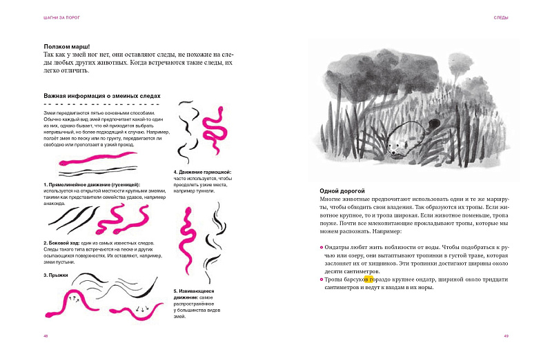 Оказывается, пресловутое школьное природоведение (если правильно его подать) может превратить обычного человека в настоящего следопыта. Без всякой иронии. Много внимания авторы уделяют изучению следов — внезапно в паре штрихов раскрывается масштабное полотно природы, насыщенное информацией о ее обитателях.