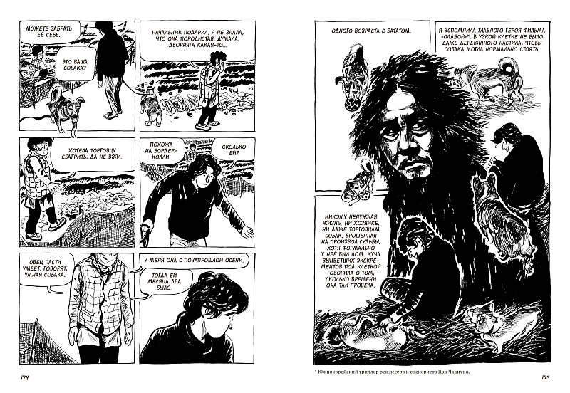 <p> Юна никогда не мечтала о собаке, но волею судьбы в её жизни появились два хвостатых любимца — вельш-корги Кабачок и дворняжка Батат. Девушка переезжает в пригород Сеула и сталкивается с ужасающей действительностью: по округе бродят множество собак, которых городские жители привезли сюда, чтобы бросить. Собакам с хозяевами повезло не больше: их запирают в тесные клетки, почти не кормят и бьют. Всем этим бедолагам уготована одна судьба: их отловят и убьют ради мяса, так как в Корее оно считается полезным для здоровья. </p> <p> В «Собаках» Ким-Жандри Кымсук разоблачает жестокость своих, казалось бы, цивилизованных соотечественников, выступает против насилия над животными и показывает волшебство, которое происходит, когда собака растёт в любящей и заботливой семье. </p> <p style="text-align: right;"> <i>Новая книга Ким-Жандри Кымсук затрагивает за живое, заставляет переживать и едва не разрывает сердца любителей домашних животных.</i><br> Booklist </p> <p style="text-align: right;"> </p> <p style="text-align: right;"> <i>Это история о жизни, уважении и открытости по отношению к другим. Мы погружаемся в повседневную жизнь заботливой пары, которая не хочет оставлять животных в руках жестоких или просто бесчувственных хозяев.</i><br> Sceneario </p>