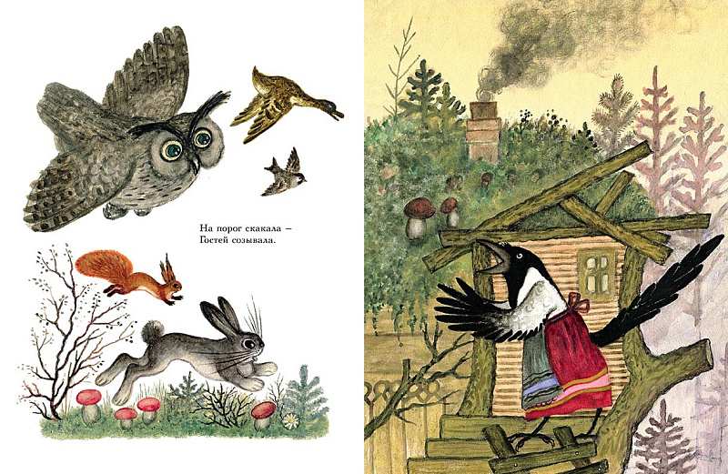 Художник нарисовал выразительных и запоминающихся персонажей и создал вокруг них притягательный сказочный мир, который благодаря дополнительным деталям выглядит как настоящий. Это и избушка, и окошки со ставенками, и печка, и одежда главной героини, и запасы грибов и рябины, и ведёрки с коромыслами, и топорик с поленом, и чугунок с кашей, и ёлочки и кустики вокруг избушки. Такие рисунки увлекают ребенка, концентрируют его внимание, помогают освоить новые слова и образы, вызывают эмоциональный отклик.