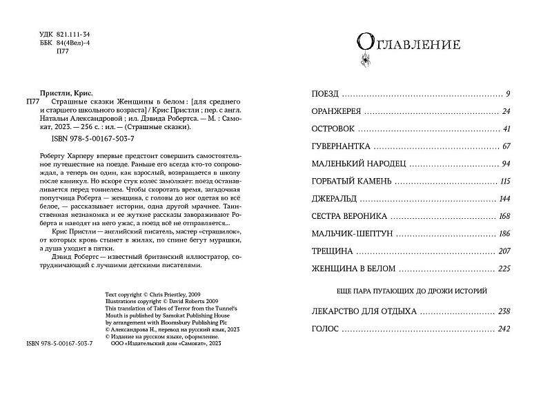 <p> Роберту Харперу впервые предстоит совершить самостоятельное путешествие на поезде. Раньше его всегда кто-то сопровождал, а теперь он один, как взрослый, возвращается в школу после каникул. Но вскоре стук колес замолкает: поезд останавливается перед тоннелем. Чтобы скоротать время, загадочная попутчица Роберта — женщина, с головы до ног одетая во всё белое, — рассказывает истории, одна другой мрачнее. Таинственная незнакомка и её жуткие рассказы завораживают Роберта и наводят на него ужас, а поезд всё не отправляется…<br> </p> <h2>5 причин купить книгу «Страшные сказки Женщины в белом»:</h2> <ul> <li> <p> Действительно жуткие страшилки для любителей жанра ужасов; </p> </li> <li> <p> Отличная стилизация под мрачные мистические рассказы для всех, кто любит Эдгара Алана По;<br> </p> </li> <li> <p> Красиво построенная композиция сборника для тех, кто ценит продуманно построенные сюжеты;<br> </p> </li> <li> <p> «Сказки...» подходят и детям, которые просто любят страшилки, и взрослым, которые хотят отвлечься от реальных страхов;<br> </p> </li> <li>Это третья книга серии. Ранее в 2021 году вышла первая книга <a href="https://samtambooks.com/book/strashnye-skazki-dyadyushki-montegyu/"><span style="color: #000000;"><u>«Страшные сказки дядюшки Монтегю»</u></span></a>.<br> </li> </ul> <p> <b> ЦИТАТЫ ИЗ КНИГИ: </b> </p> <p> <i>«— Пока я вглядывался в полумрак, мне странным образом почудилось, что Женщина в белом наклоняется ко мне. Краем глаза я заметил в окне мелькнувшее отражение: ее лицо несколько исказилось, когда она подалась вперед. Я обернулся и вжался в сиденье. Однако Женщина в белом сидела в той же позе и улыбалась, и я почувствовал себя довольно глупо». </i> </p> <p> <i>«— Кажется, вас привлекают истории о противоестественных опасностях, — сказала она, — и произведения с уклоном в сверхъестественное и таинственное». </i> </p> <p> <i>«— В конце концов, это всего лишь история, — сказал я, намеренный ее переубедить. — В историях случаются разного рода ужасные вещи. Может, в ходе рассказа они и пугают, но это проходит. Повествование захватывает, но ведь эти опасности вымышлены, не так ли? Все происходит по воле рассказчика. Это просто выдумка».</i> </p>