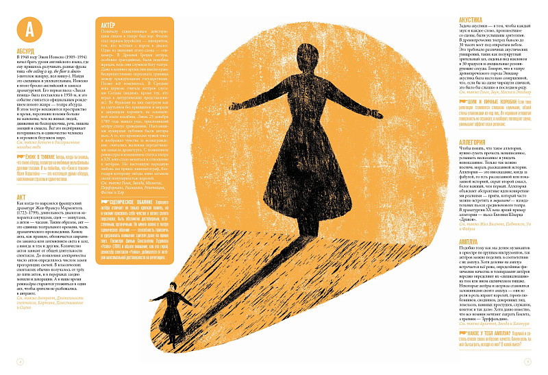 БЕЗБИЛЕТНИК, ПЕРФОРМАНС, СЦЕНА, АНШЛАГ, ЛОЖА БЕНУАРА, МЕЙЕРХОЛЬД, КУЛИСЫ, РЕКВИЗИТ, ДИОНИС. И еще более 200 слов о театре, драматургах, актёрах и режиссёрах собраны в этой книге. Это словарь — потому что театральные термины, которыми пользуются люди во всем мире, собраны тут от А до Я. Эти слова пришли из Древней Греции, из Франции эпохи Просвещения, оттуда, где зародилась и развивалась драматургия, режиссура и актерское мастерство. Наш черед наступил в ХХ веке, когда Русские сезоны Дягилева своими новшествами обогатили не только театр, но и мировое искусство в целом, Станиславский и Мейерхольда разработали системы подготовки актеров к роли, а Чехов написал пьесы, которые вот уже более ста лет идут на сценах всех континентов. А ещё это тетрадь с заданиями. Почти в каждой статье можно найти подсказки, советы или упражнения для развития актерских навыков, а на специальных разворотах — мастер-классы по изготовлению маски, декорации, кукол, грим.