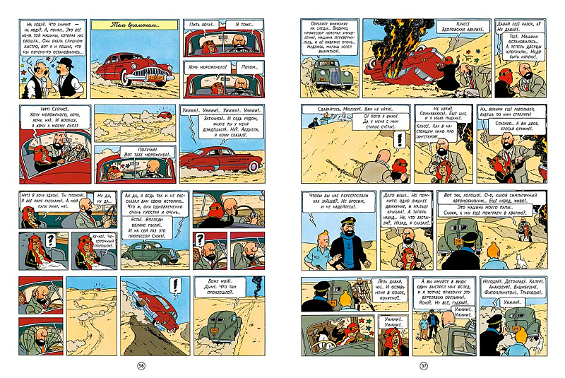 Однако идею о «взрывающемся бензине» как элементе борьбы держав и связанных с ними топливных корпораций Эрже не забыл. Он вообще не любил недоделки: если какая-то идея казалась ему достойной, он к ней обязательно возвращался. И вот в конце 1940-х, когда появление в сюжете немецких шпионов стало не только возможным, но и приветствуемым, Эрже вспомнил о старом приключении, оставшемся незаконченным (тогда история прервалась на эпизоде, где профессор Смит бросает Тинтина в пустыне). Но тут на его пути возникло одно «маленькое» (а на самом деле гигантское) препятствие: за прошедшие со времени первой публикации «Черного золота» годы в серии произошли изменения поистине тектонические – в ней появились новые персонажи, чья популярность как минимум не уступала популярности титульного героя. И если без профессора Турнесоля альбом еще можно было представить, то отсутствие капитана Хаддока не оценил бы решительно никто! А ведь история, по сути, была готова, и сильно ее менять автору не хотелось – хватало других забот. Тогда Эрже придумал виртуозный сценарный ход: одним-единственным кадром он переместил время действия альбома в текущий временной срез (см. комментарий к 3-4), а блестящее чувство юмора вкупе с глубоким пониманием собственных персонажей позволило решить проблему, казавшуюся абсолютно неразрешимой (см. комментарий к 62-15).