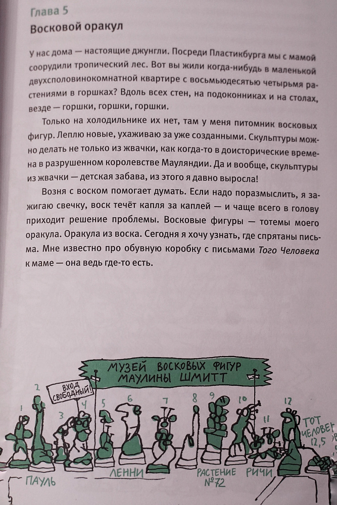 <p> Письма Того Человека спрятаны в старой обувной коробке неизвестно где. Мама читала эти письма Маулине по утрам, когда ещё была Мауляндия, и было всё. Письма Того Человека маме о волшебной и настоящей любви! И слова обладали суперсилой, потому-то мама и была счастлива и здорова - тогда... Что если отыскать эту коробку? Тот Человек вспомнит все сокровища, всё то, почему родители были вместе - и очнётся? И всё вернется на свои места? Нужно действовать немедленно! Потому что Тот Человек теперь не просто единолично владеет Мауляндией, но и - приводит туда свою новую подружку... Срочно выяснить, что там происходит! </p> <h2>5 причин купить книгу «Удивительные приключения Маулины Шмитт. Часть 2. В ожидании чуда»:</h2> <ul> <li> Уникальное сочетание текста и иллюстраций, которые дополняют друг друга, читаются как единое целое — хотя это не комикс и не книжка-картинка. Прекрасный творческий тандем исландской художницы Раун Флигенринг и немецкого автора Финн-Оле Хайнриха;    </li> <li> Удивительные приключения запредельно невероятной, исключительно неповторимой, потрясающей, ни на кого не похожей Маулины Шмитт были изданы на 10 языках мира;  </li> <li> Вы найдёте здесь и детектив, и драму, и рецепты лучшего в мире какао, а также инструкцию, как сделать собственный тайник и многое другое. Возможности этой серии по-настоящему безграничны;  </li> <li> Эта трилогия станет неиссякаемым источником тем для обсуждения и мудрых советов. В ней поднимаются следующие темы: развод родителей, переезд, поиск и сохранение друзей, болезни близких, жизнь в неблагополучных семьях, инвалидность, ответственность за тех, кого мы приручили, как справляться с переполняющими эмоциями и ещё много-много других; </li> <li> Смех и слёзы переплетены в этой серии, как и в жизни. Скорее всего она разобьёт вам сердце, но, может быть, подарит вам надежду и силы, которые помогут пережить самые страшные моменты жизни.    </li> </ul>