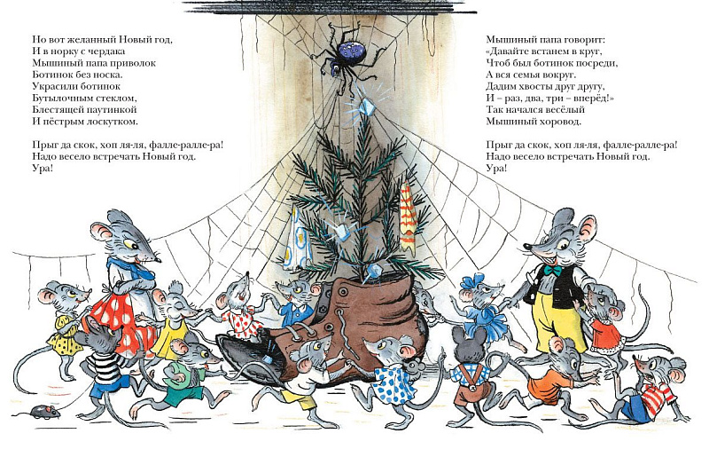 Альф Прёйсен – норвежский писатель, поэт, композитор – написал великое множество песен, стихов и сказок для детей. Сказка в стихах «Весёлый Новый год» – это уютный сказочный мирок дружного семейства мышей, которые живут в норке на чердаке.<br> <br> <i>Их новогодняя еда –</i><br> <i> </i><br> <i> Семь крошек от котлет,</i><br> <i> </i><br> <i> А тем, кто любит сладости –</i><br> <i> </i><br> <i> обёртка от конфет</i><br> <i> </i><br> <i> Но скромный праздничный стол – не причина для грусти. Мыши веселятся от души: Дадим хвосты друг другу,</i><br> <i> </i><br> <i> И раз, два, три – вперед!</i><br> <i> </i><br> <i> Так начался весёлый</i><br> <i> </i><br> <i> мышиный хоровод.</i><br> <br> Добрая и весёлая сказка легко читается и быстро запоминается. А еще она необыкновенно хорошо иллюстрирована гениальным художником Владимиром Сутеевым. Мышиное жилище и семейные отношения нарисованы с великой любовью к деталям: генеральная предпраздничная уборка, скакалки, бантики, мышки-игрушки на верёвочке, ссора из-за кусочка колбаски, развешанные после стирки штанишки, платьица и маечки многочисленной мышиной детворы, ночной горшочек из ореховой скорлупы, заботливые мыши-родители и мудрая мышь-бабушка, сидящая на качалке-картофелине, и много-много других милых подробностей мышиного быта.<br> <br> Рекомендуется для чтения взрослыми детям-дошкольникам, а также для совместного рассматривания картинок.<br>