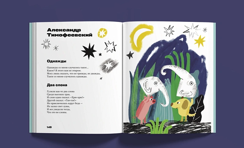 Всего в сборнике 90 авторов: Яков Аким, Валентин Берестов, Марина Бородицкая, Александр Введенский, Станислав Востоков, Артур Гиваргизов, Олег Григорьев, Галина Дядина, Юлий Ким, Юрий Коваль, Сергей Козлов, Григорий Кружков, Вадим Левин, Новелла Матвеева, Анастасия Орлова, Ирина Пивоварова, Маша Рупасова, Ольга Седакова, Александр Тимофеевский, Ирина Токмакова, Саша Чёрный, Корней Чуковский, Михаил Яснов и еще 67 поэтов разных поколений — и 151 стихотворение, некоторые из которых вы сами читали в детстве, а другие станут для вас открытием.